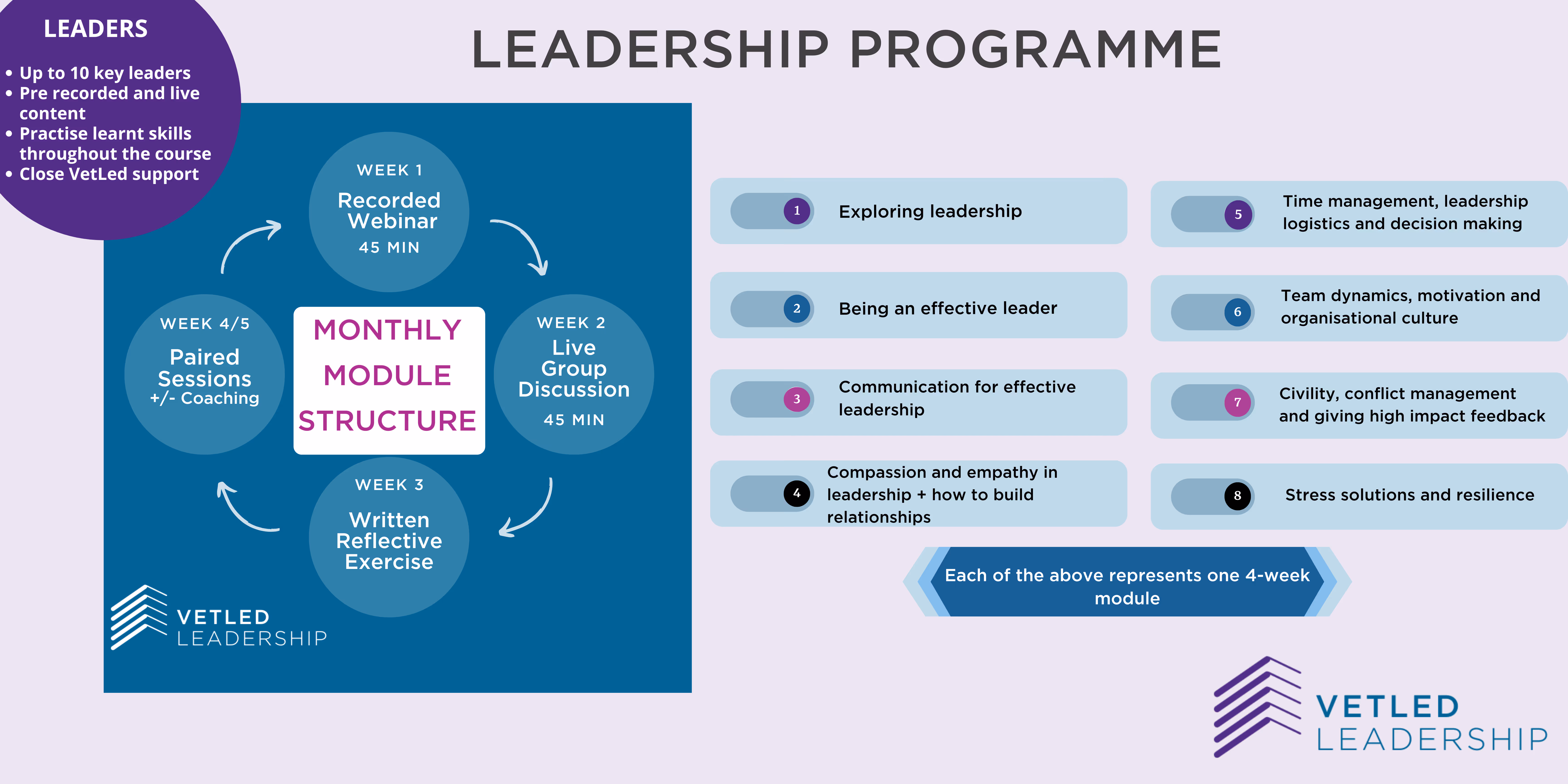 The programme consists of 8 modules, each lasting 4-5 weeks. A module requires about 3.5-4hrs (additional time for any coaching that is requested). The live session with the VetLed team is 45 minutes and is booked in advance. The other components of the module can be completed at your own pace each month.
